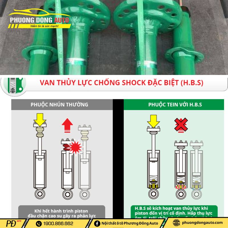 Để khắc phục những hạn chế trên, TEIN đã trang bị cho các sản phẩm giảm xóc của mình hệ thống chặn thủy lực H.B.S (Hydraulic Bump Stopper). Khi piston di chuyển đến vị trí cài đặt trước, H.B.S sẽ tự động kích hoạt, van thủy lực sẽ thu nhỏ lại, từ đó làm giảm tốc độ di chuyển của piston một cách êm ái và trơn tru. Lực va đập sẽ được chuyển hóa thành nhiệt năng và tỏa ra môi trường, giúp bảo vệ các bộ phận bên trong giảm xóc.